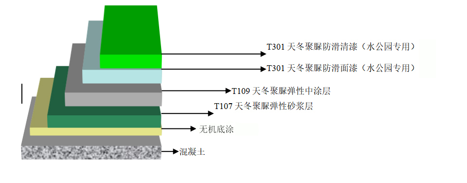 5、聚脲防滑清漆層:刷涂T301防滑清漆,用量0.15-0.2kg/ m2,厚度 0.15mm;