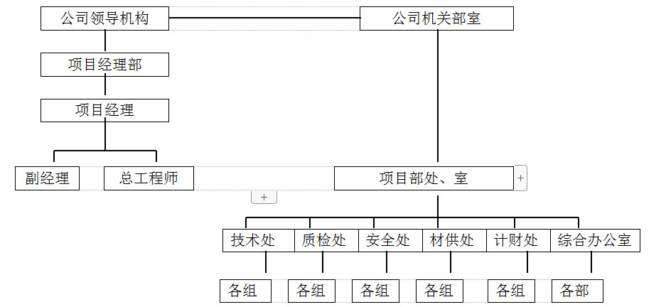 項目部實行項目經理負責制,設項目經理一名,對現場施工、經營、人事負責任;設項目副經理、技術總負責(項目總工)各1人負責工程施工調度、工程技術、質量、安全監控分項工作;項目部下設“五處一室”,各處室按照職責行使管理職能。